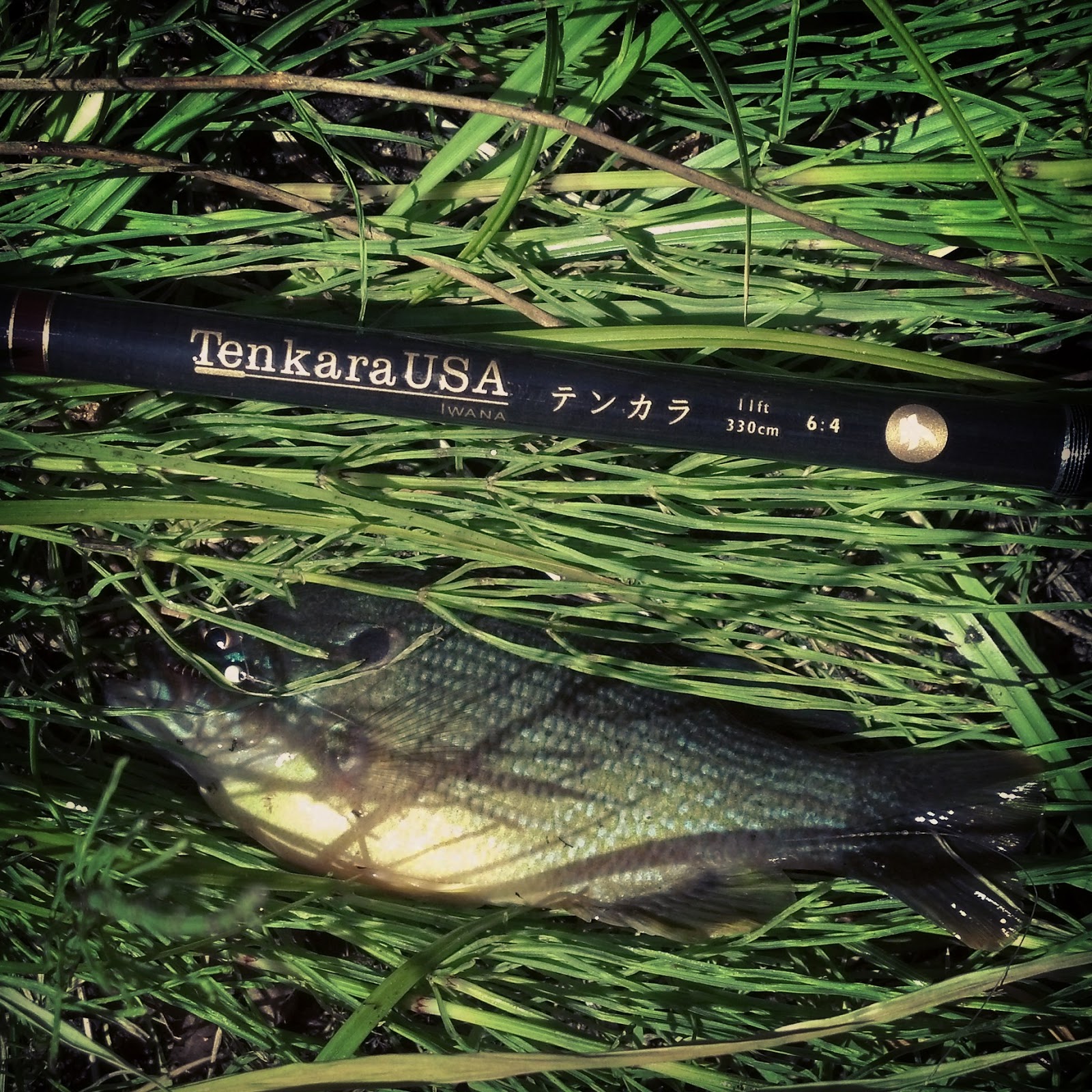 Example #3 There is a pond near a business park that looked prime for bluegill so I thought I would check it out. While there was a lack of No Trespassing signs I still didn't feel comfortable fishing with a lot of people driving in and out of the gate. This pond empties out under a small road then forms a pool before becoming a very shallow very narrow creek. Right away I saw bluegills in the pool and with a few casts with the Tenkara I had some to hand.